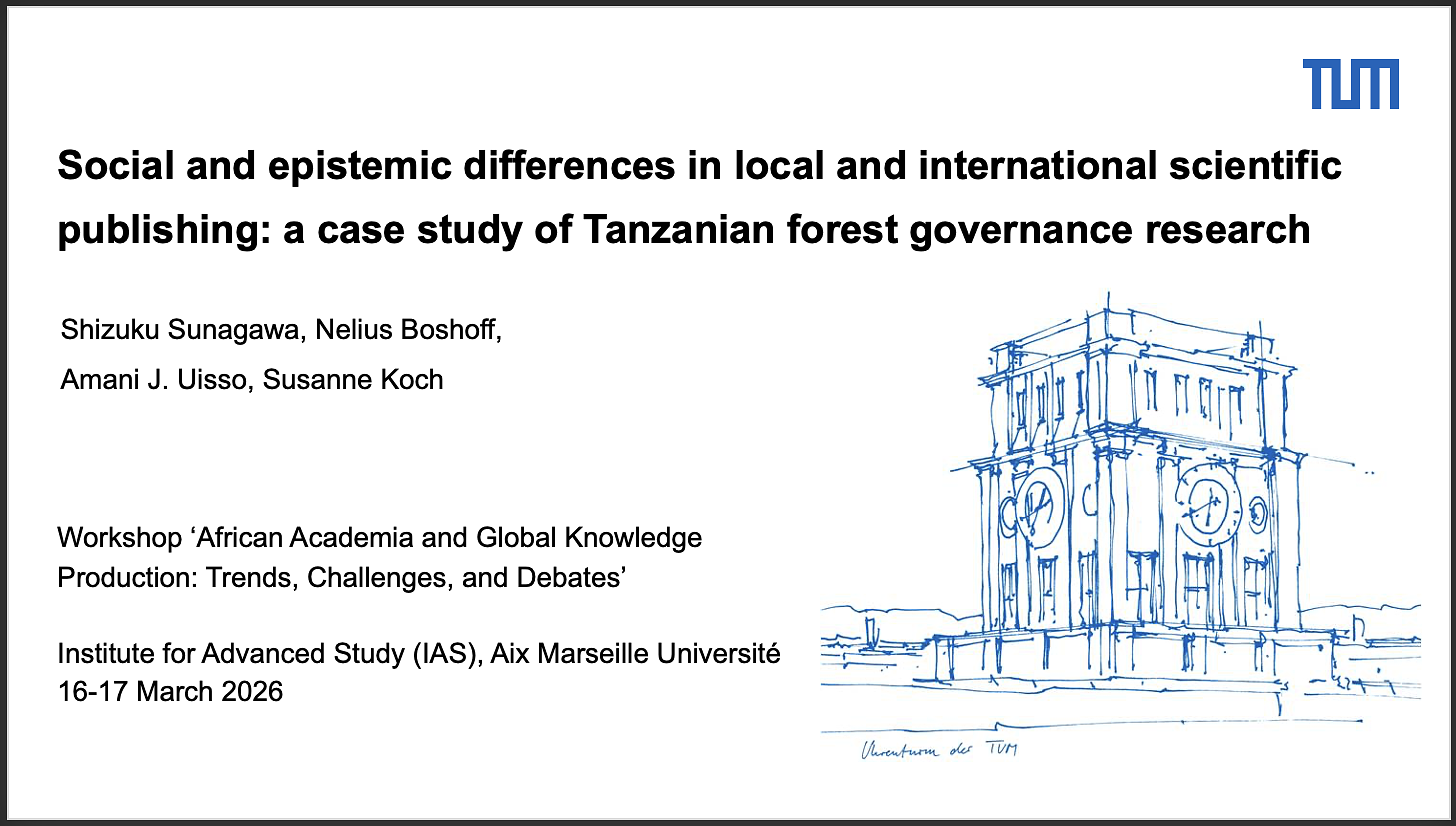 From 16-17 March, 2026, Shizuku Sunagawa and Susanne Koch contributed to a workshop entitled African Academia and Global Knowledge Production: Trends, Challenges, and Debates, hosted by Prof. Abdoulaye Gueye at the Institute for Advanced Studies (Iméra) of Aix Marseille University (Iméra). Their talk featured a study on social and epistemic differences in local and international forest governance research.
